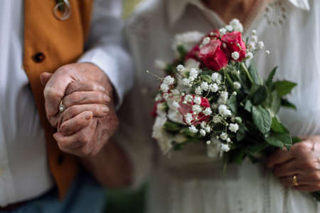 Hands of bride and groom with rings on wedding bouquet. Marriage concept