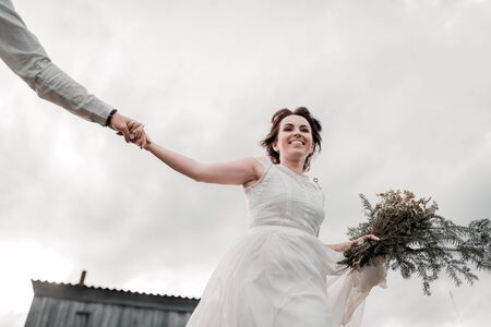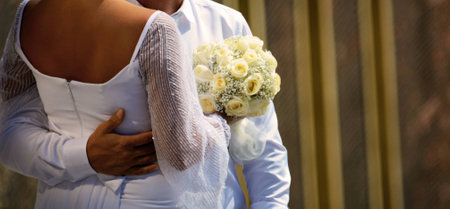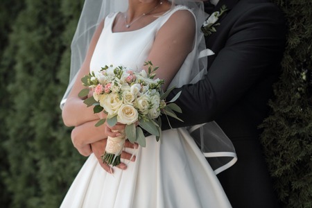 A bouquet of white flowers in the hands of the bride. The groom holds the bride in his hand