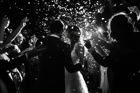 Joyful wedding celebration couple surrounded by guests throwing confetti in a romantic night venue