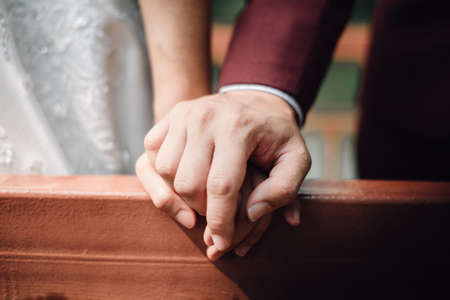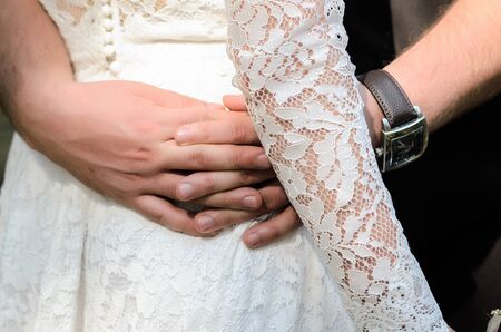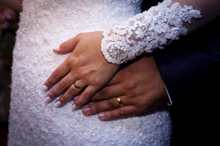 man and woman holding hands. wedding rings bride and groom on the background. Wedding ceremony. Jewelry.
