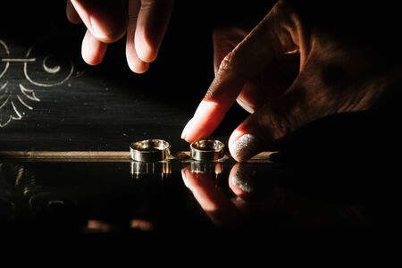 hand of the bride and groom close-up, wedding rings, horizontal photo
