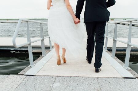 Beautiful bride and groom on their wedding day. Bridegroom and bridegroom at sunset.