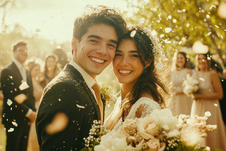 A joyful couple in wedding attire holds a bouquet while guests celebrate their union outdoors with falling confetti in a beautiful garden setting.