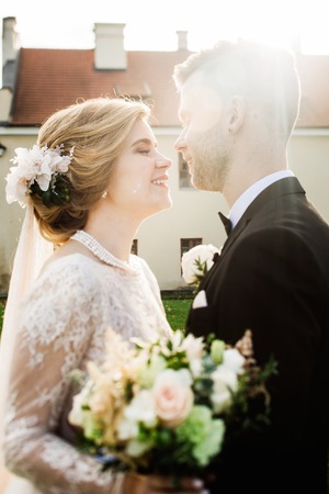Beautiful newlyweds hugging near the ancient door. Wedding portrait of a stylish groom and a young bride near old house in in a European town.