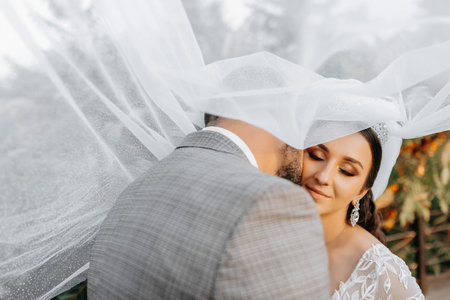 Beautiful bride and groom embracing and kissing on their wedding day outdoors.