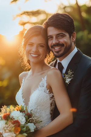 A happy Brazilian bride and groom posing for a wedding portrait with a stunning sunset in the background, both smiling warmly at the camera.