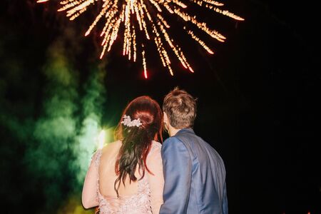 The lovers give flowers to the bride and kissed happy and couple love standing in wedding studio