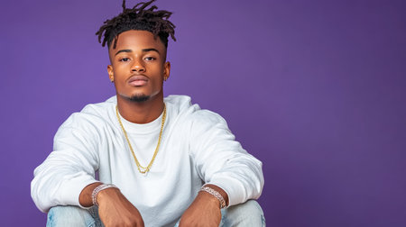 A young man with serious expression sitting against purple background