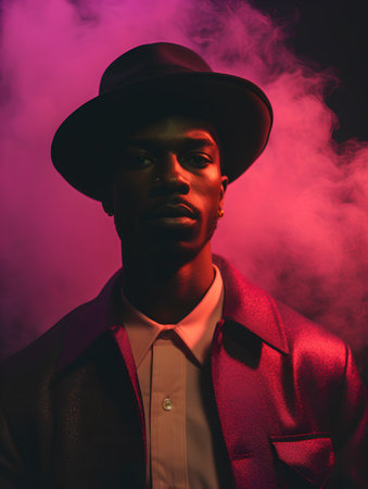 Black man fashion portrait on abstract colorful background. Afro american male model looking at camera, neon colored lighting. Created with Generative AI