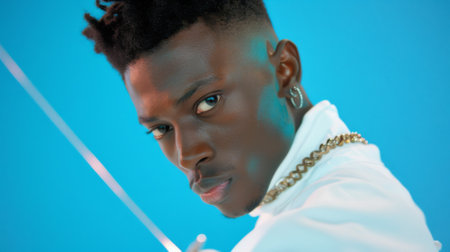 portrait of an hip hop music musician. Cinematic image of a man wearing party clothes and jewels