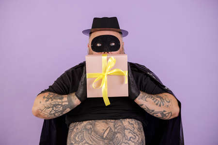 Emotional mature plump gentleman in hero costume holds present on purple background