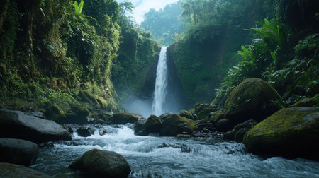 A clean, flowing waterfall surrounded by mossy rocks and dense jungle vegetation