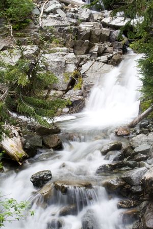Long exposure of a waterfall flowing over rocks in a mountain stream.
