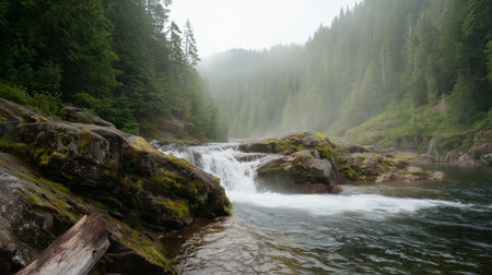 A powerful waterfall plunges into a rocky basin, framed by a dense forest of evergreen trees. The scene is enveloped in a soft mist, creating a serene and atmospheric ambiance. The composition features a natural color palette of greens, grays, and whites. This image can be used for various commercial or editorial applications.