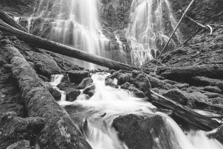 Vivid green moss and whitewater at Proxy Falls in Oregon, USA. Natural beauty in the remote forest of western Oregon in the Pacific Northwest. Black and white.