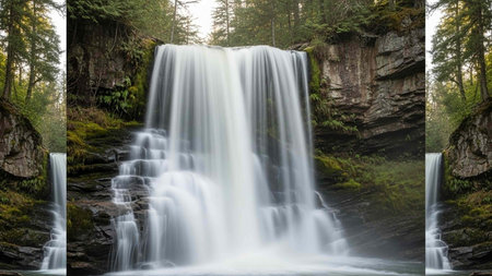 Experience the stunning beauty of a serene waterfall cascading through a lush green forest under soft morning light, creating a tranquil atmosphere in nature.
