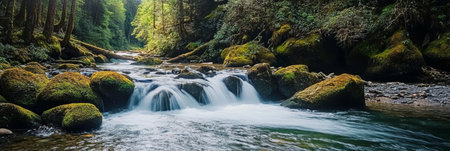 Waterfall in the forest. Long exposure. Panoramic image.