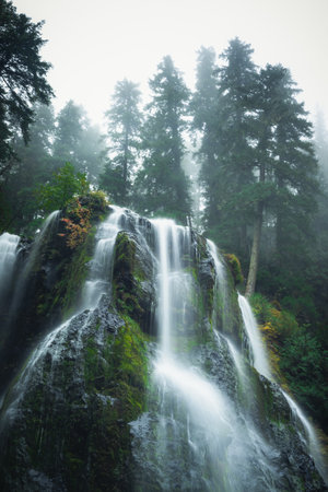 Waterfall in the coniferous forest in the mountains in the fog