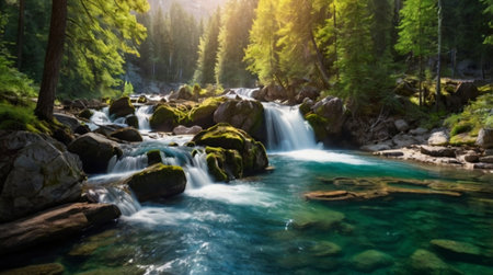 Majestic Sunlit Wilderness Stream Cascades Over Rocks, Forming Waterfalls and Calm Azure Pools Below