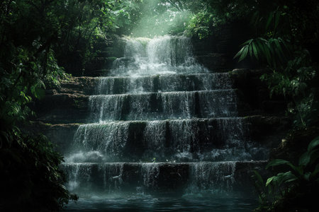 A serene waterfall cascades over multiple layers, surrounded by lush greenery in the Amazon Rainforest of El alleso Yucatan Mexico --ar 3:2 --v 6.1 Job ID: 42bf97a8-be83-41a8-bb90-a630d49748a8
