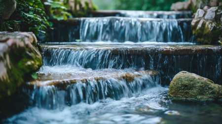 Discover a peaceful scene of waterfalls flowing over rocky terrain, surrounded by lush greenery, offering a serene escape into nature for relaxation and inspiration.