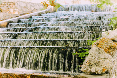Water flowing down a terraced wall in Chadwick Lakes in Malta