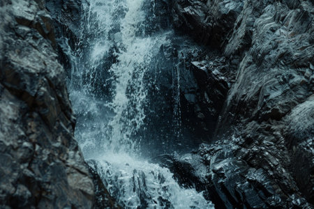 A waterfall is pouring water down a rocky cliff. The water is clear and cold, and the rocks are jagged and rough. The scene is serene and peaceful