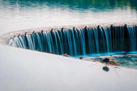 Flowing reclaimed water cascading over industrial sluice gates. Generative AI