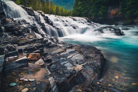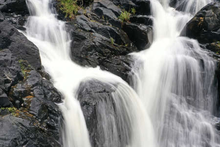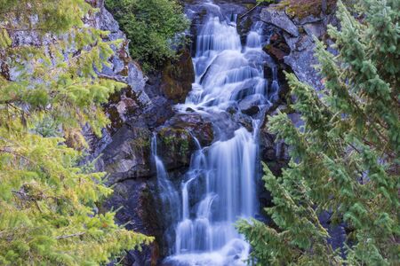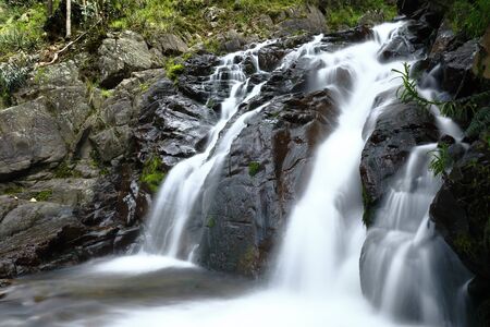 Long exposure of a waterfall flowing over rocks in a mountain stream.