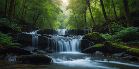 Tranquil forest waterfall, panoramic, sunlight through trees, soft flowing water