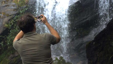 Travel man with mobile phone shooting video of waterfall in dark rainforest
