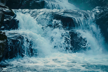 A breathtaking view of a powerful waterfall cascading down rugged mountain rocks, enveloped in mist, showcasing the vibrant blue waters of a pristine natural landscape.