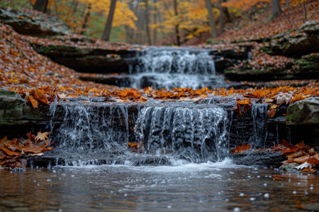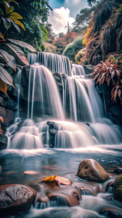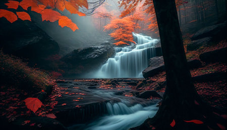 An AI generated illustration of a waterfall flowing down the rocks in a forest in autumn