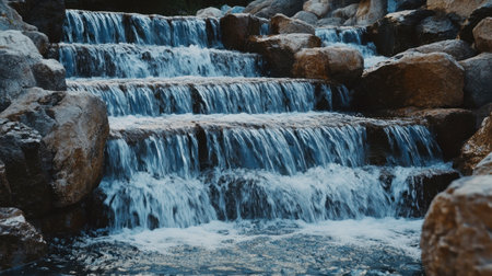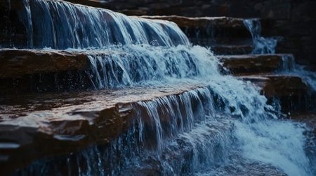 A slow-motion shot of a waterfall, capturing the smooth flow of water over a series of terraced rocks.