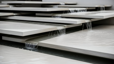 A tranquil, abstract scene of water gently cascading down stacked, minimalist stone platforms, creating a sense of calm and modern design.