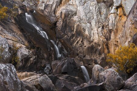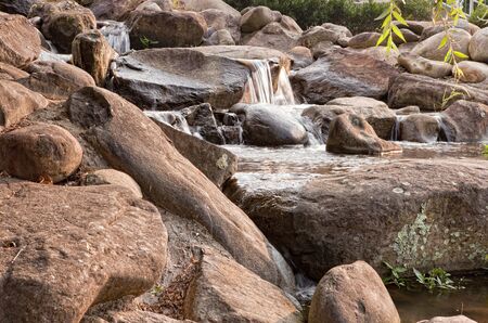 A tranquil waterfall flows gently in the midst of rugged rocks, creating a peaceful oasis in nature.