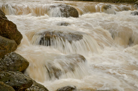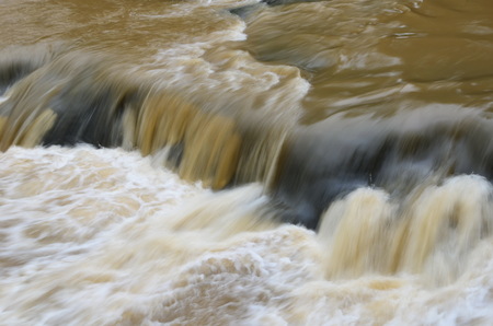 Wild water flowing turbid brown in the canals, weir, which has a wooden bridge hanging above it.