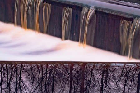 In a weir a lot of water flows along the weir, reflection of trees in the water, water movement with prolonged exposure. Location: Friesland, Netherlands.
