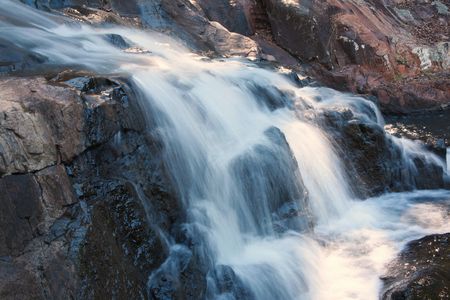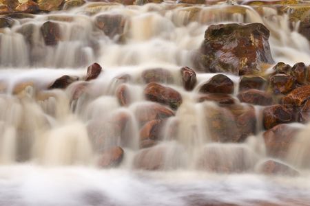 Long exposure of a waterfall flowing over rocks in a mountain stream.