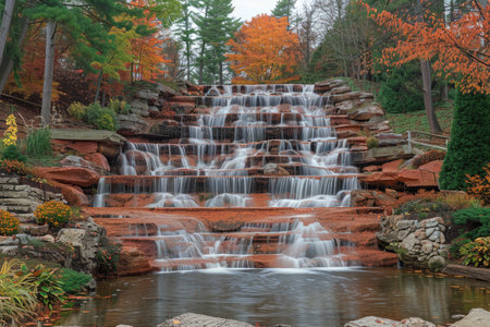 gentle waterfall flowing over colorful autumn leaves, created with generative ai