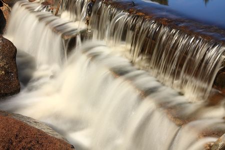 A slow-motion shot of a waterfall, capturing the smooth flow of water over a series of terraced rocks.