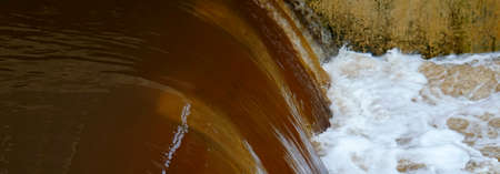 Rust colored water spilling over a dam. Man made waterfall on a river