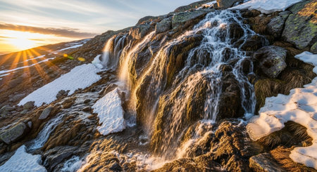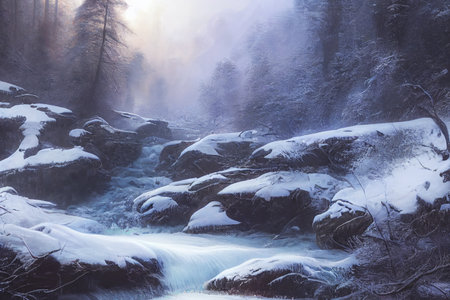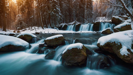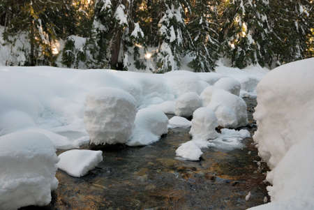 Winter mountain stream at sunset covered in fresh snow