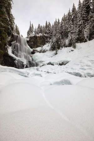 Beautiful Canadian Winter Landscape of the Waterfall during a white snowy day. Taken at Alexander Falls, Near Whistler and Squamish, North of Vancouver, BC, Canada.