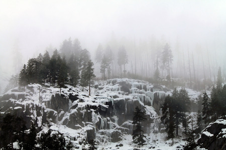 Snow Covered Rocks with Foggy Evergreen Trees, Washington State