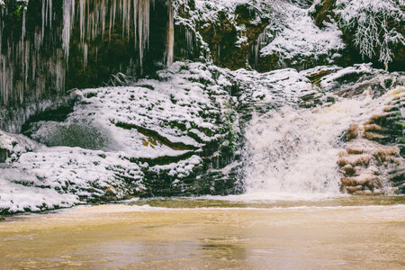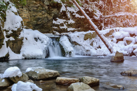 A small active waterfall. Clean mountain stream, snowy winter landscape, wildlife background