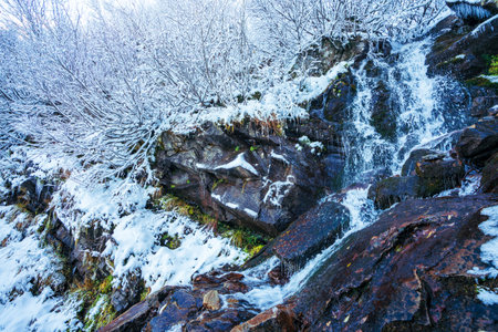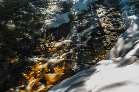 Small waterfall of cold water flow among the stones covered with snow