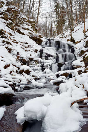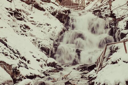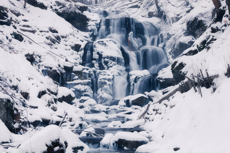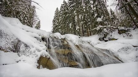 Scenic view of the beautiful Shypit waterfall in the Carpathian mountains, winter landscape. Popular tourist attraction, nature travel background suitable for wallpaper or cover