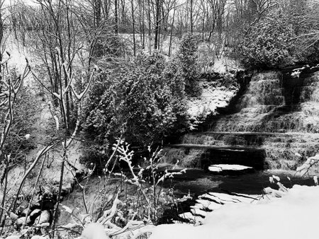 Winter landscape with a waterfall in the forest. Black and white photos.