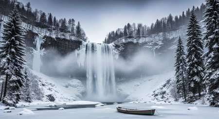 A serene waterfall frozen in winter, with snow covering the rocks and the river. The water is crystal clear and still, creating a peaceful atmosphere.